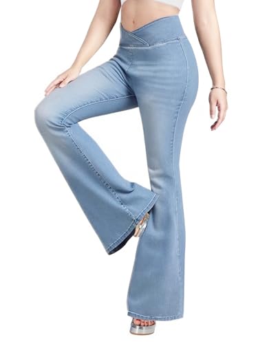 Fabric type: 66.5% Cotton, 27.5% Polyester, 3% Elastane, 3% Viscose.Care instructions: Machine WashOrigin: ImportedClosure type: Pull OnContoured Cross Waist High Rise Bootcut Jeans with a contoured cross-waistband design that enhances your curves while smoothing the midsection. Featuring a retro bootcut silhouette that stays snug through the hips and thighs, then gradually widens from the knee down for an elongated, proportionate look with balanced slimming effectUltra soft stretch jean for women maintains its shape while delivering ultimate comfort and flexibility. Wrinkle-resistant fabric requires minimal maintenance, allows free movement with long-lasting durabilityThe flare jeans for women are available in S/M/L with waist measurements 27-28/29-30/31-32 and hip measurements 35-36/37-38/39-40Machine wash cold (with like colors), avoid bleach, hang/flat dry to maintain shape. Wrinkle-resistant fabric eliminates ironing-ready to wear straight from the dryer. Low-maintenance design saves time while delivering effortless styleElastic wais jeans for women with a versatile design suitable for multi-occasion wear, from casual daily outfits to business attire. Pair with basic tees and knee-high boots for weekend outings. The functional flare cut elongates the leg line, making it ideal for professional settings, casual outings, home relaxation, social events, and shopping Perfect for everyday use. finest materials and excellent craftsmanship ensure long-lasting durability.